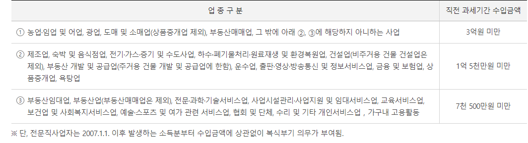 해당 과세기간에 신규사업을 시작하였거나 직전 과세기간의 수입금액이 다음과 같이 해당하는 사업자는 간편장부 대상자가 됩니다.